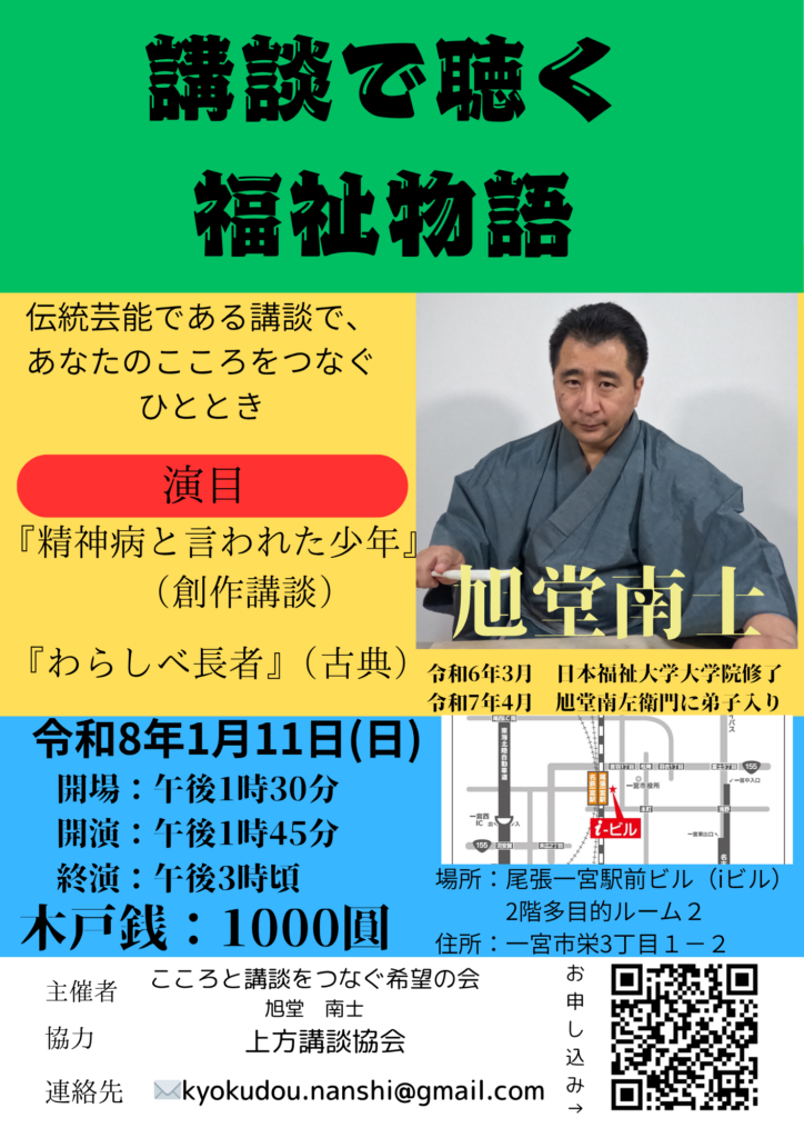 精神保健福祉士の資格を持ち、精神障害者の就労支援の経験がある講談師・旭堂南士が、そんな精神障害者が抱えてきた差別の歴史、彼らへの支援や福祉の経緯、そして現在の状況など、精神障害者に関することを幅広く皆様に読み聞かせ致します。