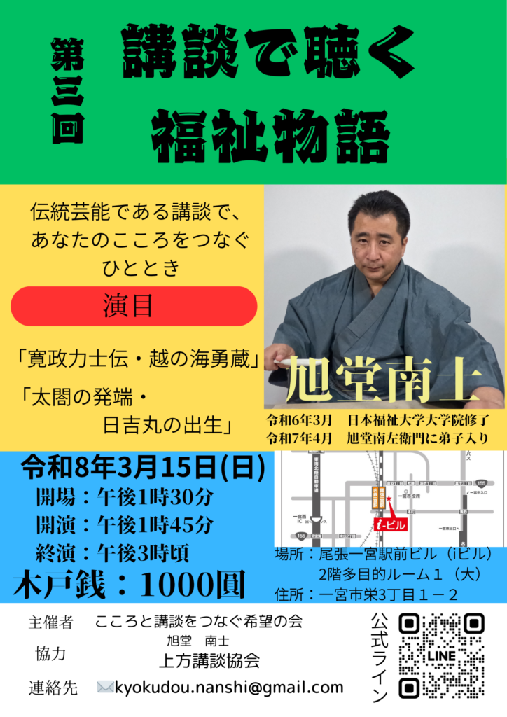 精神保健福祉士の資格を持ち、精神障害者の就労支援の経験がある講談師・旭堂南士が、そんな精神障害者が抱えてきた差別の歴史、彼らへの支援や福祉の経緯、そして現在の状況など、精神障害者に関することを幅広く皆様に読み聞かせ致します。